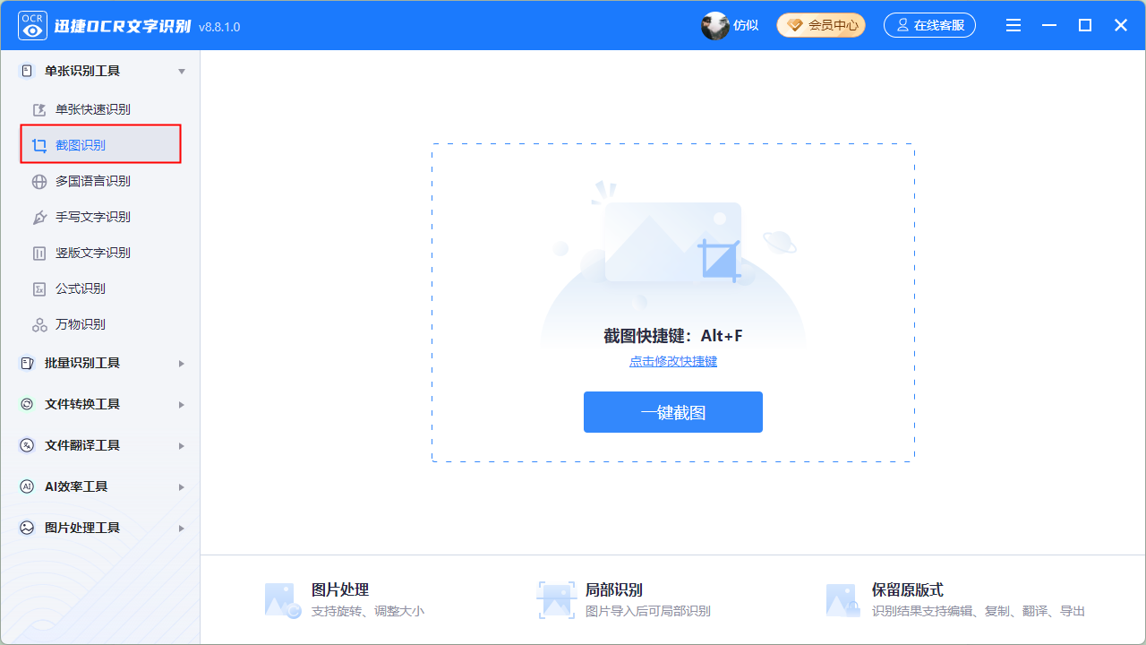 Введите функцию « распознавание скриншотов», чтобы распознать текст на изображении, используя комбинацию клавиш « Alt + F» или нажмите кнопку « Снимок экрана».